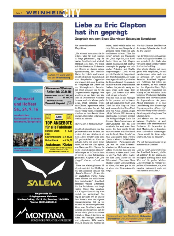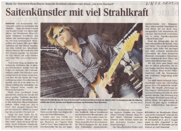 "Bei der dritten Blues Night von "Muddy´s Club" platzte der Weinheimer Schlosshof mit run 700 Besuchern aus allen Nähten. Sie erlebten einen Ausflug in die soul- und bluesseligen 60er und 70er Jahre. Eigentlich dürften die Zeiten vorüber sein, in denen Sebastian Strodtbeck und seine Band als Support angekündigt werden. Der Rolle des Nachwuchsgitarristen ist der 38-jährige Weinheimer längst entwachsen. Er pflegt einen soliden britischen Rythm´n´Blues-Stil und hatte mit der Blues- Nummer "Cheer Up" eine Uraufführung zu bieten. ..."